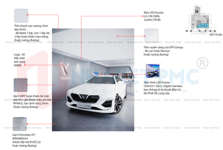 Vật liệu hoàn thiện như gạch Porcelain khổ lớn, trần thạch cao kẻ line kỹ thuật và hệ chiếu sáng LED trắng được lựa chọn nhằm làm nổi bật sản phẩm – trong trường hợp này là các mẫu xe điện.