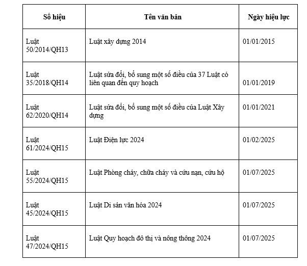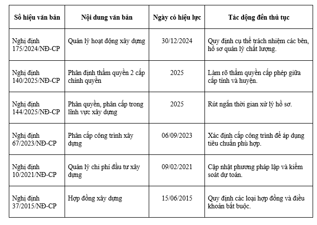 Năm 2025, ngoài Luật Xây dựng 2014 và các lần sửa đổi trước đây, nhiều văn bản luật mới tiếp tục bổ sung, điều chỉnh, tác động trực tiếp đến thủ tục xây dựng: