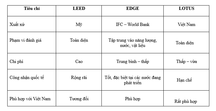 Khi nói đến “chuẩn xanh” trong xây dựng, ba bộ tiêu chuẩn nổi bật nhất hiện nay là LEED, EDGE và LOTUS. Đây là những hệ thống đánh giá công trình xanh được công nhận rộng rãi, giúp doanh nghiệp định hướng và chứng minh cam kết với phát triển bền vững.